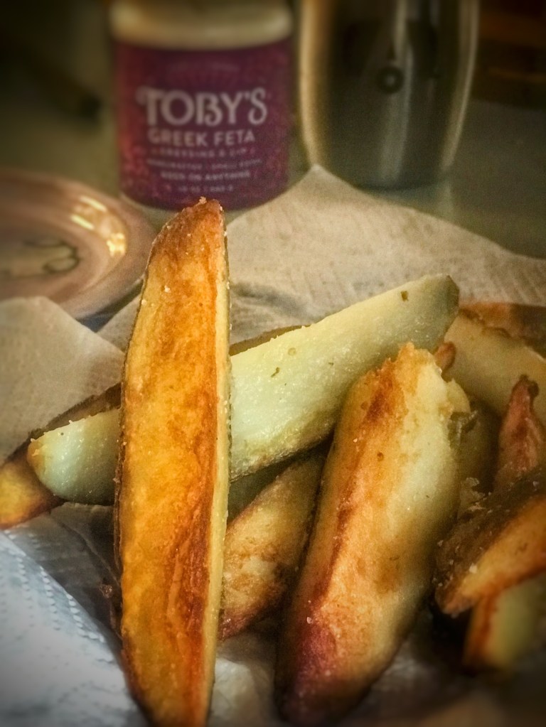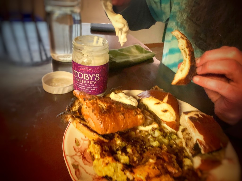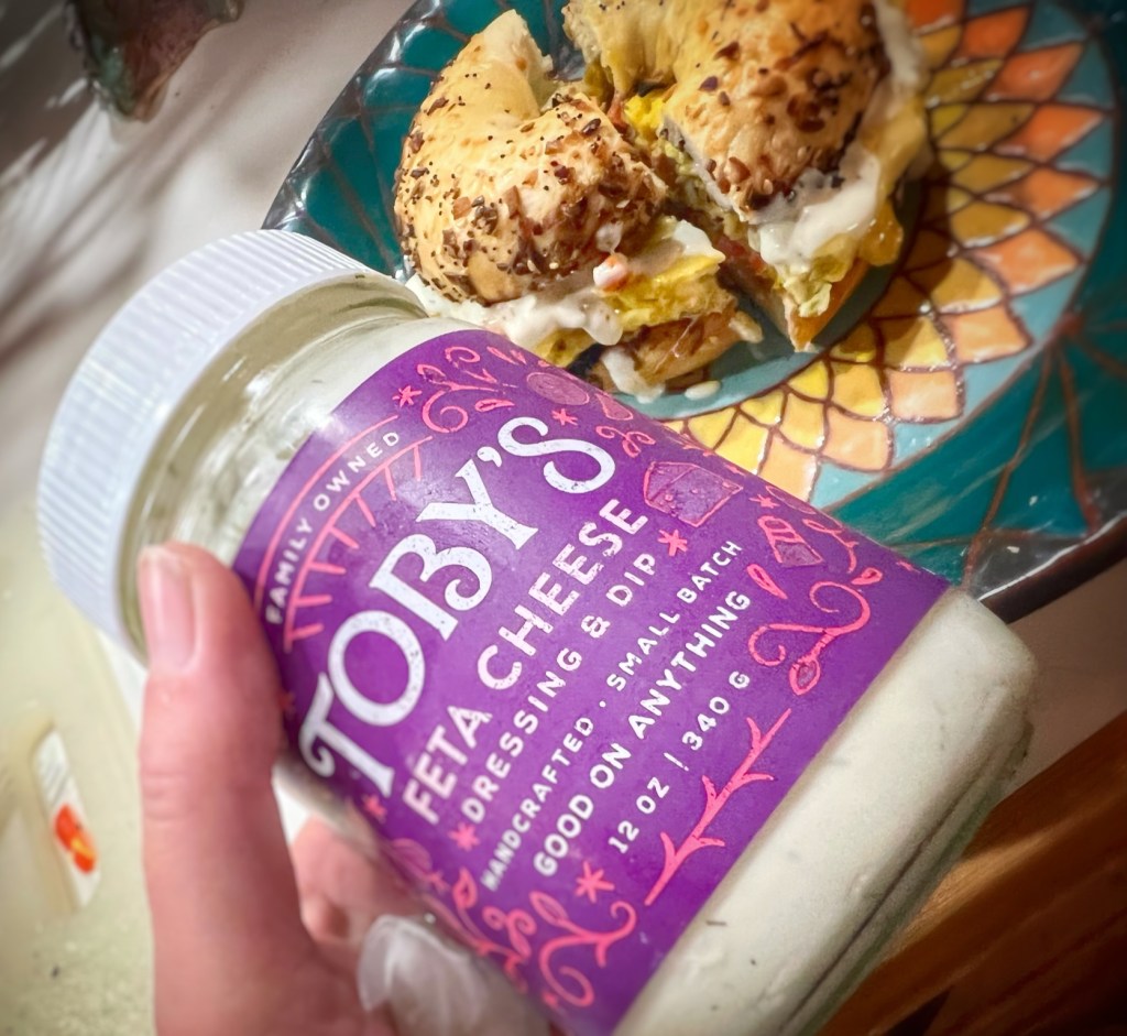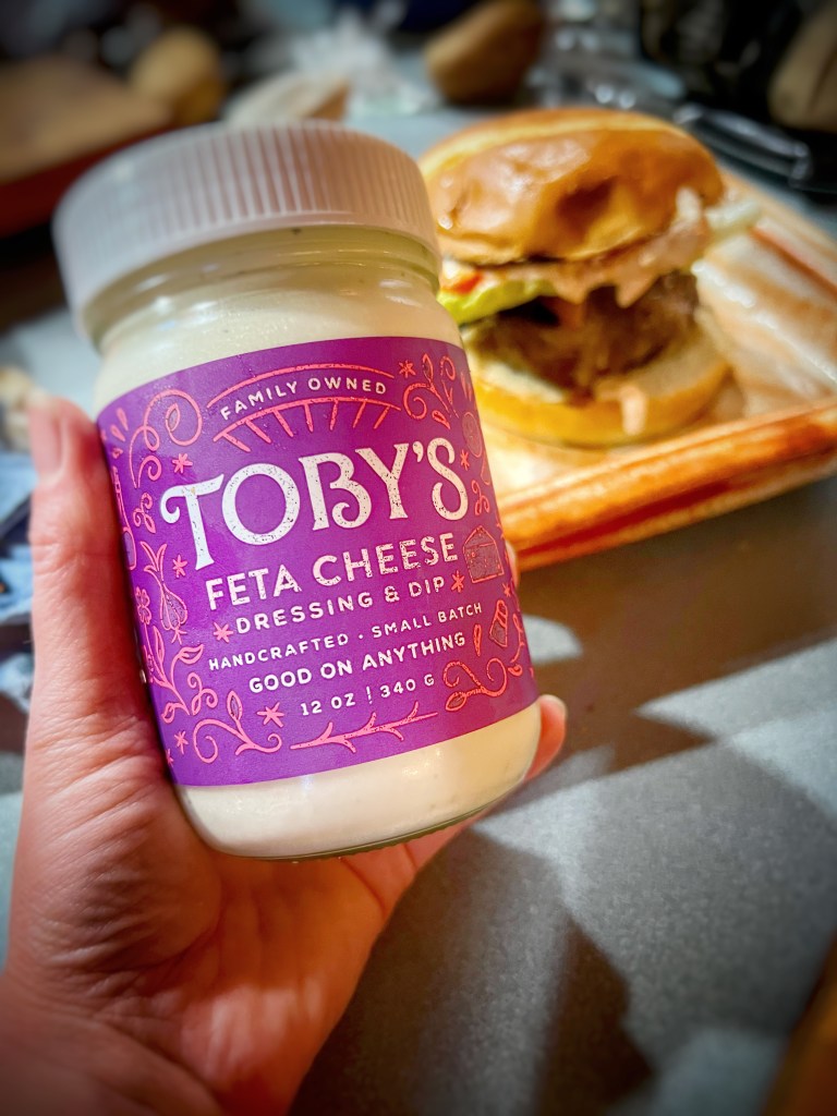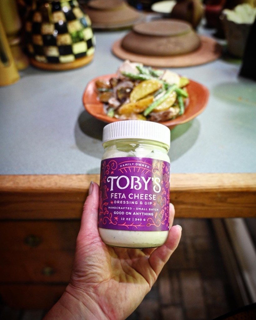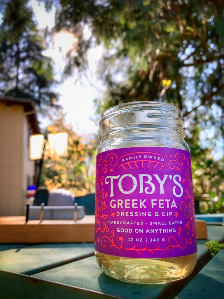 Tasty and local, Toby’s Family Foods is a favorite in our house with their Greek Feta Dressing taking top honors . . . you can tell because it didn’t take long before empty Toby’s salad dressing jars take over your cupboards with their easy-to-remove labels and mason jar-sized lids making for easy storage containers and convenient beverage glasses.